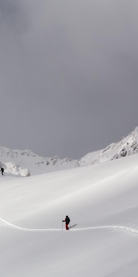 Der zweite Tag beginnt dort, wo der erst aufgehört hat. Motiviert für neue Abenteuer starten wir in Lü zunächst auf dem markierten Winterwanderweg in Richtung Alp Champatsch. Die Hütte ist zwar auch im Winter bewirtschaftet, aber für einen Kaffee sind wir noch etwas zu früh. Daher beschliessen wir, rasch weiterzugehen. Kurze Zeit später biegen wir ab in den Tiefschnee. Unverspurtes Gelände und eine erfahrene Bergführerin zur Seite: Das Leben kann schön sein. Das nächste Ziel ist die Fuorcla Funtana da S-charl, der Scheitelpunkt der heutigen Tour. Bis dahin werden wir dann 600 Höhenmeter absolviert haben. Zuvor erreichen wir jedoch noch eine Schlüsselstelle. Ein Kessel gefüllt mit einer riesigen Menge pulvrigem Schnee. Unsere Bergführerin Chantal erklärt uns nun einige Optionen, welche Passage heute machbar wäre und wie wir sie begehen sollten. Wir entscheiden uns, den Kessel am Hang einzeln zu traversieren. Eine wirklich spannende Erfahrung, bei der aber auch die Kraft der Natur mit jedem Schritt spürbar ist. Nach dem Passieren freuen wir uns nun auf die Mittagspause. Nach einer halben Stunde erreichen wir die Bar Aunta im kleinen Skigebiet Minschuns. Bei heissem Kaffee und einem leckeren Sandwich geniessen wir ein wunderschönes Gipfelpanorama. Der Blick reicht vom Ofenpass bis zur Ortler-Gruppe und das Val Müstair liegt uns zu Füssen.
