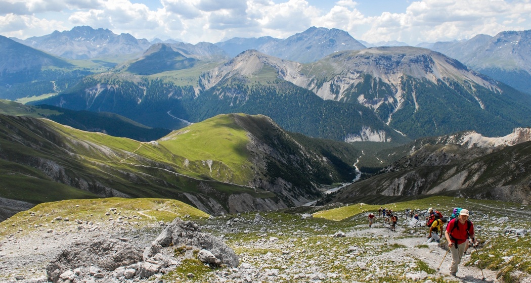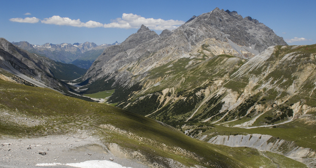 Der Weg in Richtung Osten würde zum Aussichtspunkt Margunet führen, unsere Route wendet sich aber nach Norden und mutiert zum Zickzackweg, der über blumenreiche Weiden führt und in kurzer Zeit 400 Höhenmeter überwindet. Je höher der Weg steigt, desto grandioser wird die Aussicht, die im Süden bis zum Bernina-Massiv reicht und im Osten den Ortler und das Stilfserjoch erkennen lässt. Kurz vor der Fuorcla ist neben dem Weg eine kreisrunde Doline zu erkennen, ein Trichter, der entsteht, wenn das Gestein im Untergrund ausgewaschen wird und die so entstandenen Hohlräume einstürzen.