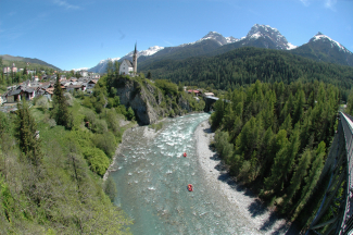 Bald passieren wir Scuol. Vor allem die Kirche ist prägnant auf dem Felsen, schon von Weitem ersichtlich und lässt uns kurz inne halten, bevor wir uns bereit machen und mit kräftigen Ruderschlägen auf die nächste Stromschnelle zusteuern.