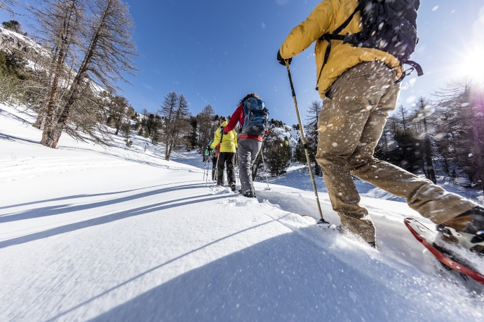 Snowshoeing in the Engadine is a real insider tip in Graubünden due to its many secluded mountain valleys. Discover the natural treasures on a snowshoe tour through the region, for example with local mountain guides and hiking guides on.